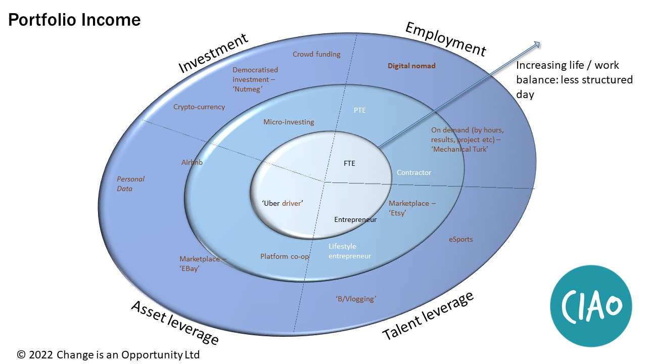 The third shift is that increasingly a portfolio income – made up of several of these at any one is becoming more common, and has been enabled by the ability to many of these in what used to be ‘leisure time’, or at least without them consuming the whole day. And this fits neatly into what Lynda Gratton and Andrew Smith in their book/site 100 year life suggests – that we need to think about work in a completely different way. Not a single career, but something which flexes with our point in life, and the life style we want and can afford. Employment has usually in the past been seen as secure – and that will be key for parts of our life. Freedom to travel, to develop and explore is much more of a characteristic of those in their late teens, twenties and increasingly healthy 60’s-80’s. There is so much scope here for choice.